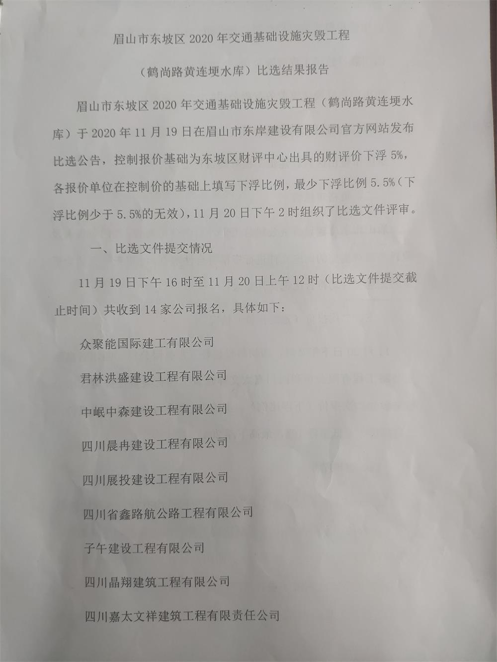 眉山市東坡區(qū)2020年交通基礎設施災毀工程(鶴尚路黃連埂水庫)勞務隊伍比選結(jié)果